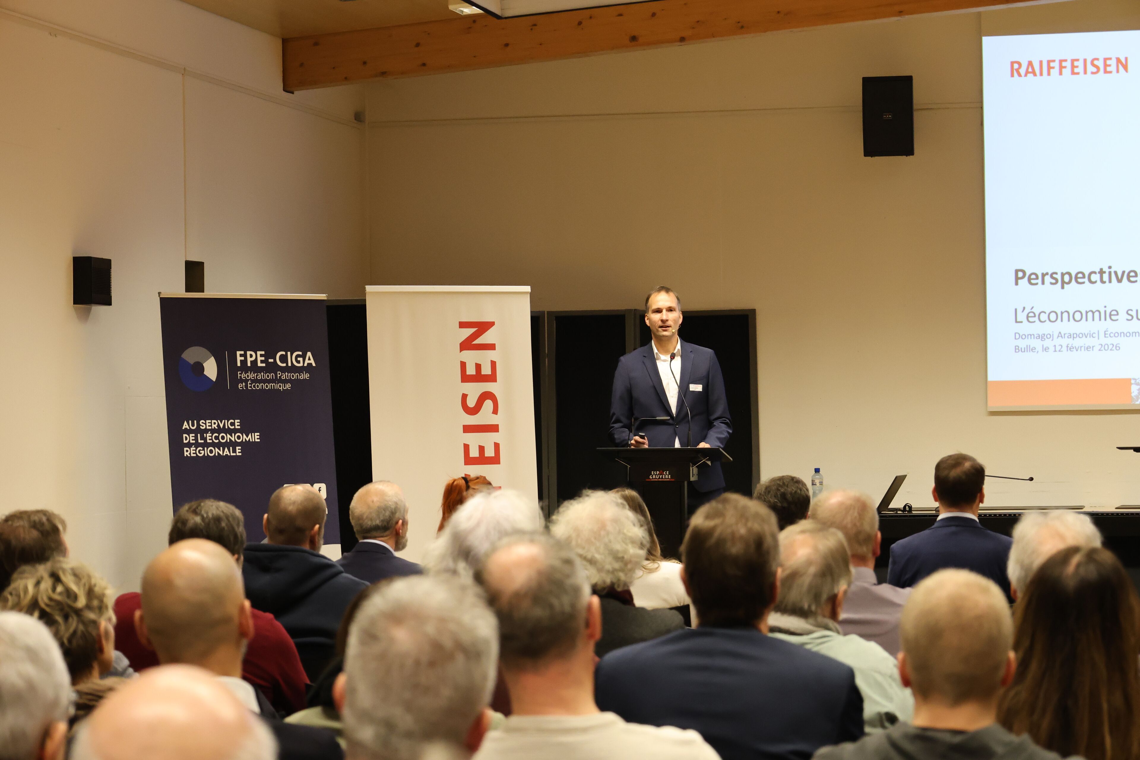En 2025, malgré l’impact des droits de douane sur la croissance mondiale, le ralentissement économique s’est révélé moins fort que prévu. Qu’en est-il pour 2026 ? A quoi les entreprises fribourgeoises doivent-elles s’attendre ? Tour d’horizon de la question avec l’économiste Domagoj Arapovic lors de notre événement organisé jeudi dernier avec la Banque Raiffeisen Moléson.